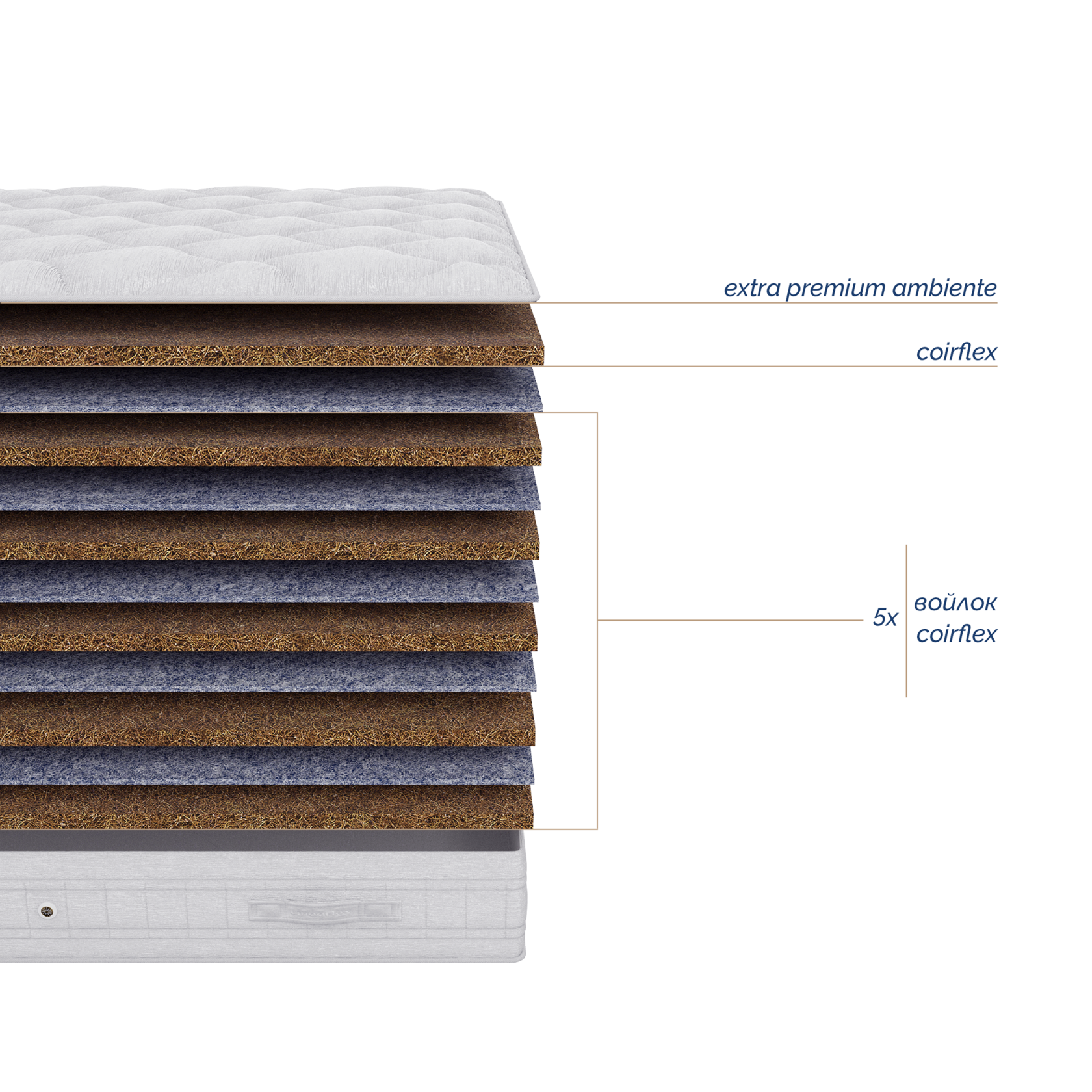 Coirflex - комфортный слой из натуральной кокосовой койры, пропитанный натуральным латексом (50% волокно кокосового ореха, 50% латекса). Гибкий и упругий, обладает ортопедическим эффектом и устойчив к нагрузкам. Придаёт жесткость матрасу.